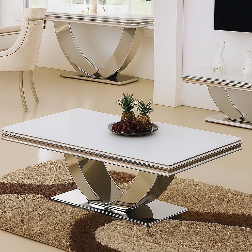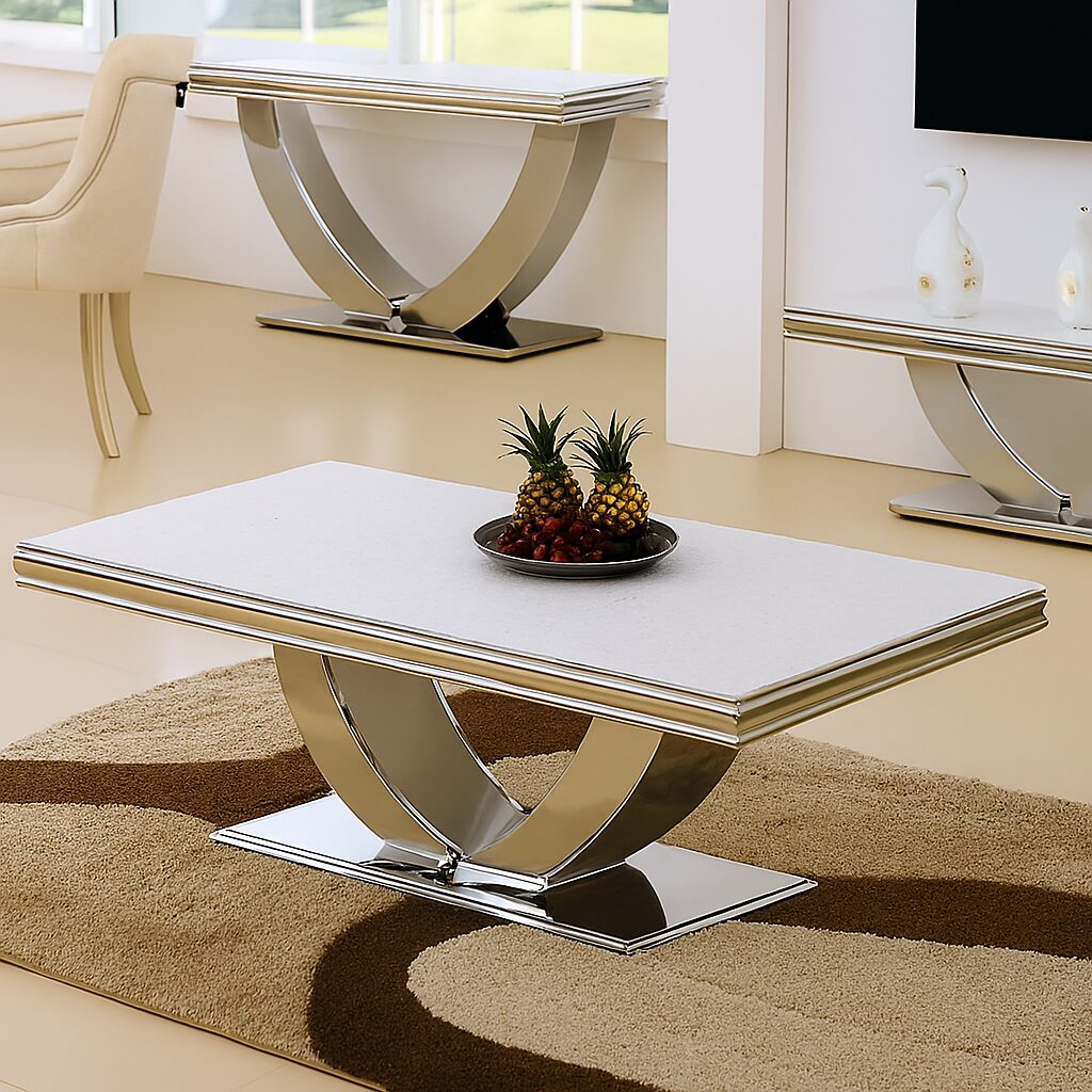 The tabletop is gracefully supported by a polished stainless steel swooping base, creating a sculptural silhouette that adds modern elegance to your space. Perfect as a statement centrepiece, the Arianna blends form and function for the ultimate in contemporary luxury.